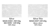 Pure silver is beaten into thin sheets, as thin as 0.5 microns thick. Available as leaves, rolls, gilding kits, silver powder, shell silver and silver foil.